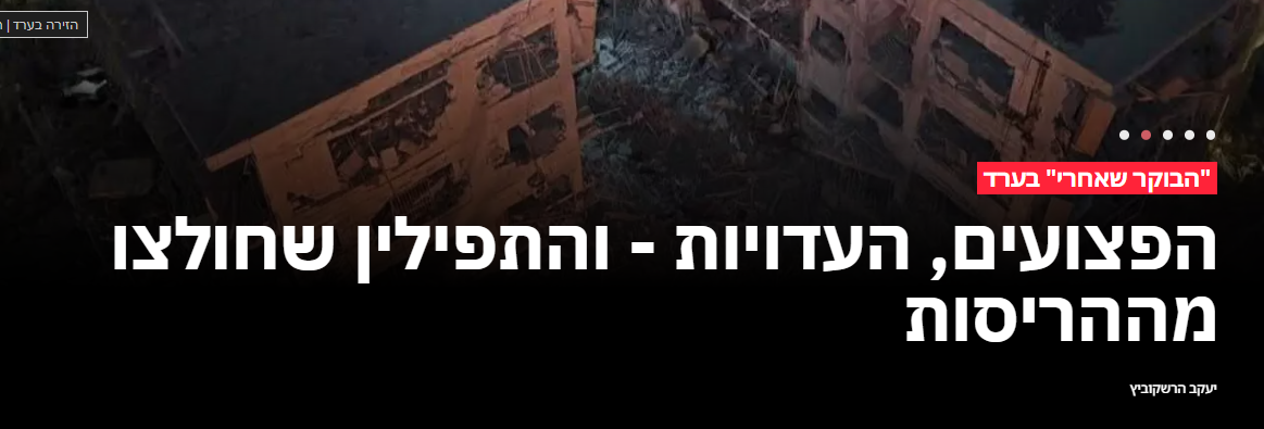 והמשכתי לשוטט, לנסות לקבל תמונה ברורה של מה שקרה, בעוד כמה אתרי-חדשות, והגעתי גם, בעוונותיי, לאחר החדשות של "היום", ואז חשכו עיניי עוד יותר, למראה הכותרת הראשית באותיות קידוש לבנה על רקע תמונות ההרס והבעירה מהפגיעה בערד: