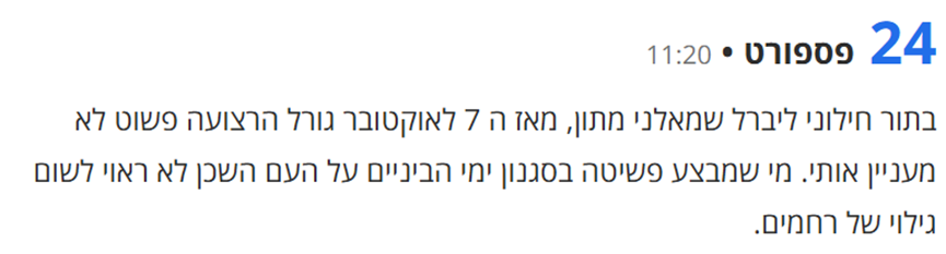 השפה הרהוטה והפיסוק המדויק, מעידים שכנראה לא מדובר כאן בבוט איראני או חמור חוראני, אלא בתגובה אותנטית של אדם משכיל חי וקיים, שעל אף שהוא מביע תמיכה ומלאה ברצח העם שביצעה ישראל בעזה, מגדיר עצמו, ובגאווה, כ"חילוני ליברל שמאלני מתון"' ולהאמין לעצמו שהוא כזה.